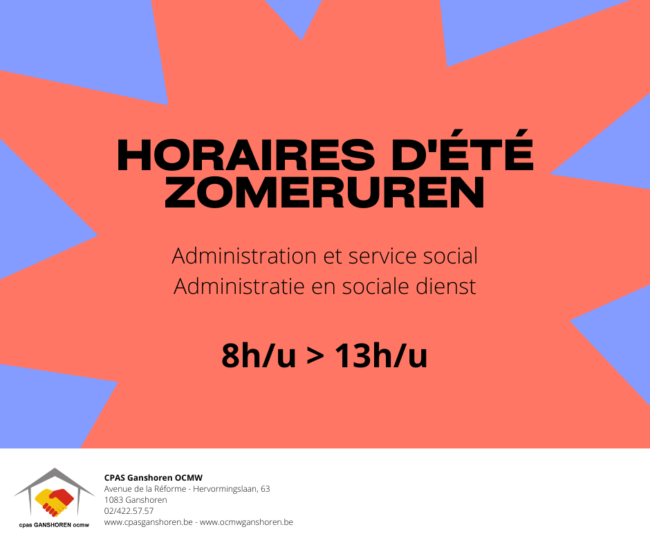 Van 1 juli tot 31 augustus 2022 zullen de administratie en de sociale dienst van het OCMW tijdens de zomer open zijn. Tijdens deze periode wordt u verwelkomd tussen 8…