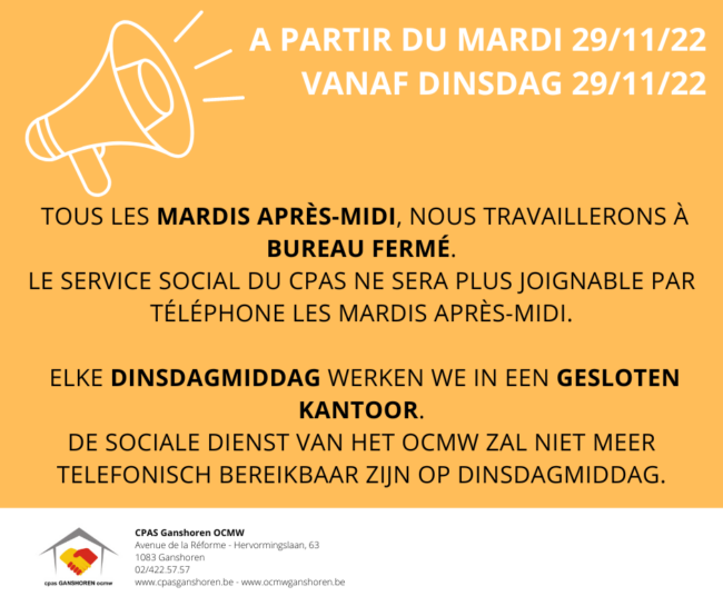 Vanaf dinsdag 29 november werken we elke dinsdagmiddag in een gesloten kantoor. De sociale dienst van het OCMW zal niet langer telefonisch bereikbaar zijn op dinsdagmiddag.