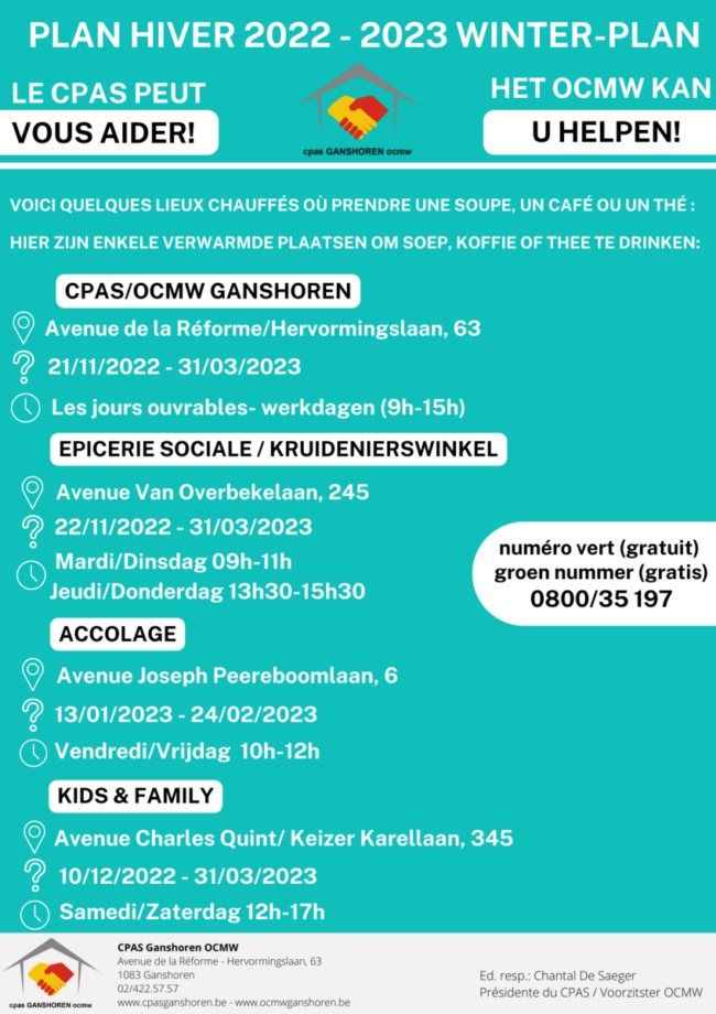 Het OCMW Ganshoren activeert zijn winter plan tijdens de winterperiode, van 21 november 2022 tot en met 31 maart 2023. Het winter plan helpt geïsoleerde mensen in perioden van extreme…